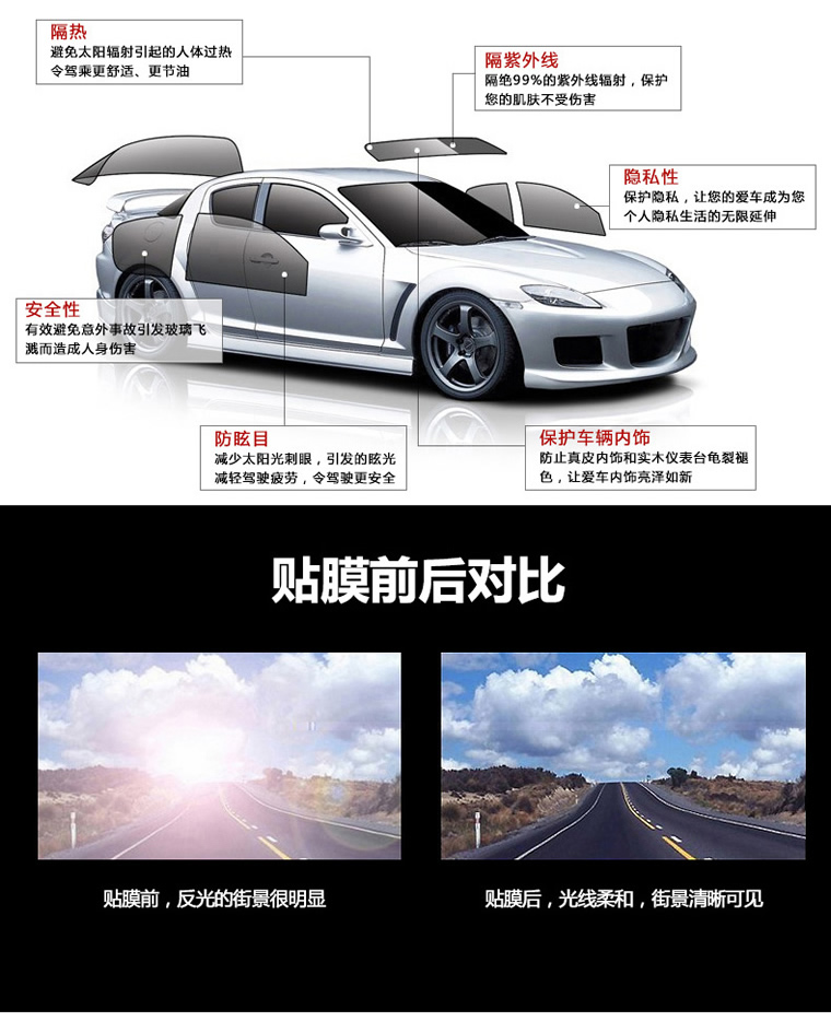 1、阻隔夏季热量,保持车内凉爽2、节省制冷费用3、保持窗户的视野清晰