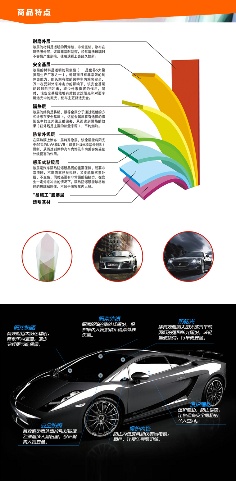 关键词:碳膜,纳米,磁控,钛金膜,太阳膜,汽车膜,隔热膜,防爆膜,护肤膜,安全膜
